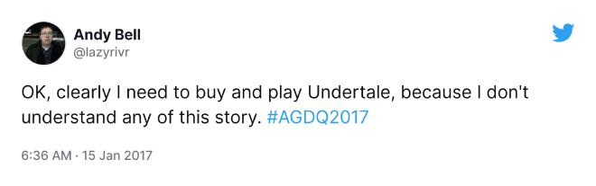 A tweet of mine from January 15, 2017, that says ‘OK, clearly I need to buy and play Undertale, because I don’t understand any of this story. #AGDQ2017’